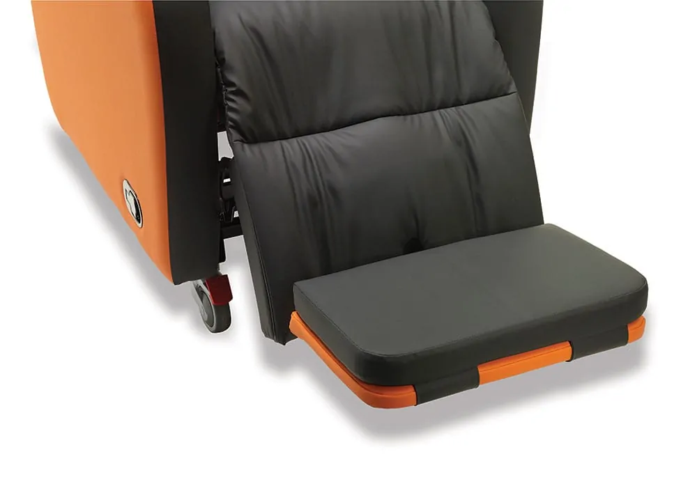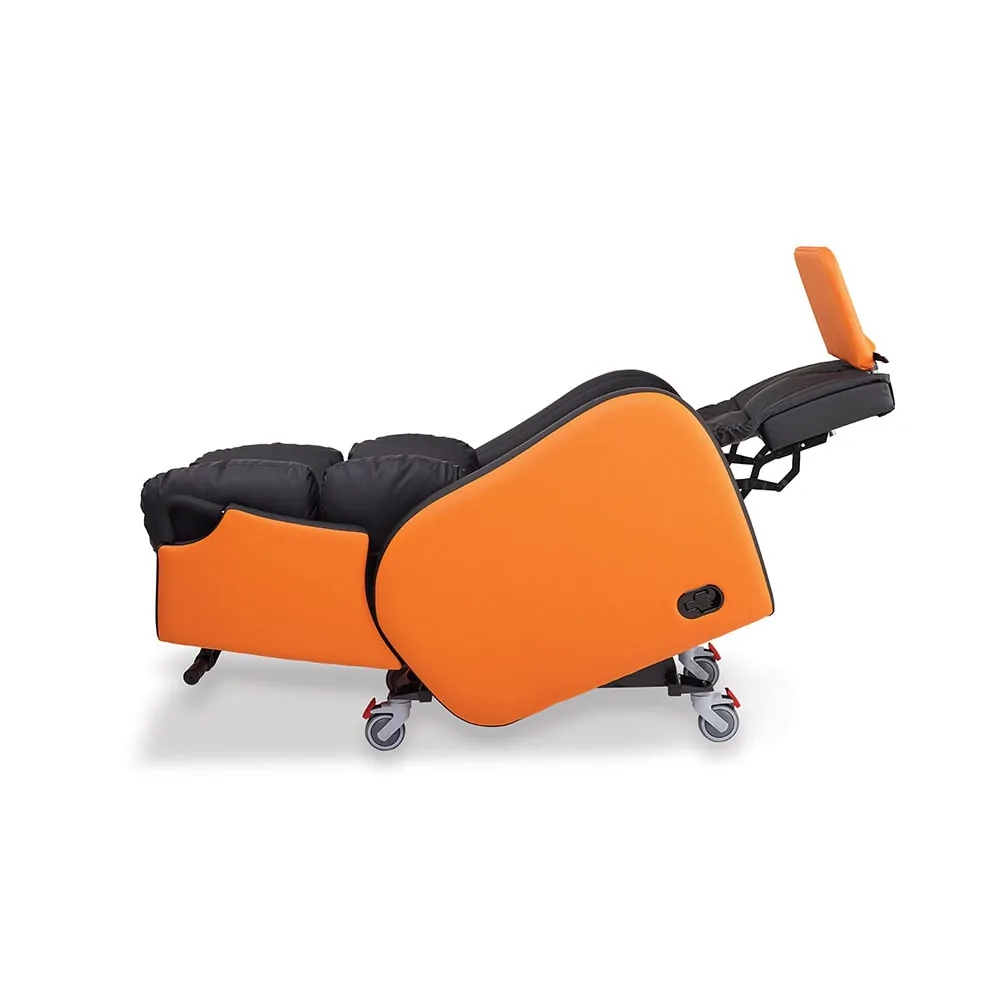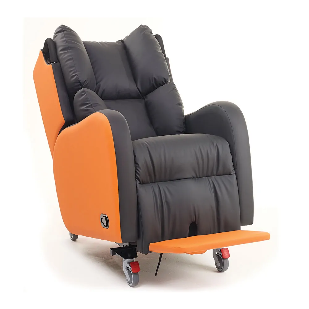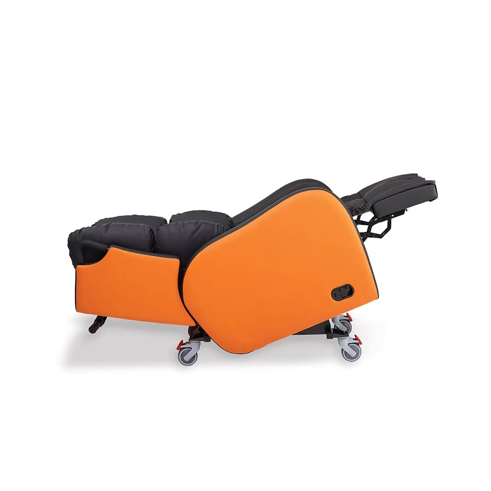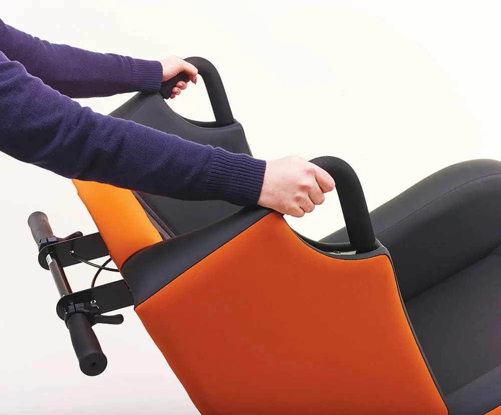 Independent Tilt In Space (TIS)The Independent Tilt in Space works to counteract the effect of the person’s pannus. By having control over the angle of tilt you can adjust that person’s centre of gravity’ making them feel more comfortable, supporting the pannus, and reducing the feeling that they are being dragged forward by external forces. The TIS movement allows the seat to back angle to remain the same whilst the whole seating system is tilted backwards, which means that the angle of the hips, knees and ankles are not affected during this movement. It also reduces the weight on the Ischial Tuberosities and redistributes the weight through the back. This constant back angle prevents shear and friction during movement. This feature can also help when moving someone in a hoist and can support better pelvic positioning by optimising the use of gravity to position the user in the optimal position. |
