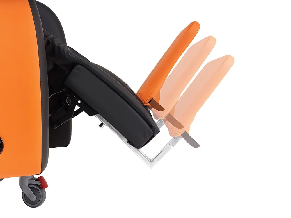 Independent Leg Rest AdjustmentThe leg rest on the Boston has been designed slightly longer to support good positioning of the legs. It also has a gentle profile shape to support the legs from slipping from the leg rest and reduces the risks associated with individuals crossing their legs. The leg rest angle can be changed independently and can move 90° degrees from the standard seating position. Please note that on the manual chair the leg rest can be adjusted using the lever on the side of the chair as illustrated. |