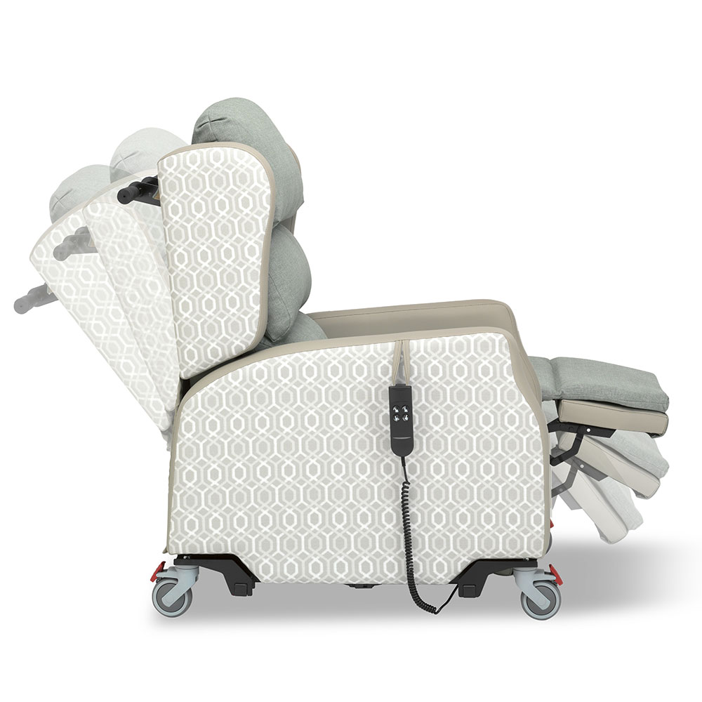 - The independent recline allows the user to maintain flexibility over their body’s position, particularly the amount of hip flexion, enabling them to maximise comfort as well as managing health needs.