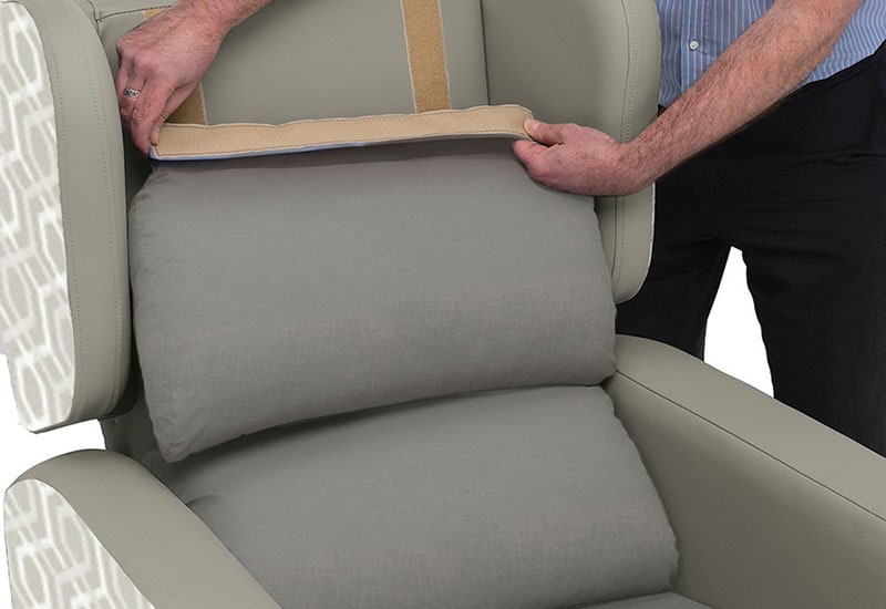 Pressure Management Back CushionsThere is a choice of six interchangeable and adjustable pressure management back cushions that enable the chair to be adapted to a single user’s changing needs or to adapt the chair to another user. This ensures greater longevity of its usage. In addition, all cushions can be repositioned to suit a user’s individual seating preferences and fibres added or removed from fibre filled cushions to adjust firmness. Covers can also be removed for cleaning or replacement. See Back Cushion Section for details on the individual cushions. |
