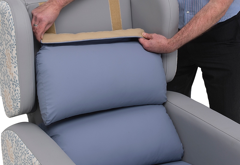 Pressure Management Back CushionsThere is a choice of seven interchangeable and adjustable pressure management back cushions that enable the chair to be adapted to a single user’s changing needs or to adapt the chair to another user. This ensures greater longevity of its usage. In addition, all cushions can be repositioned to suit a user’s individual seating preferences and fibres added or removed from fibre filled cushions to adjust firmness. Covers can also be removed for cleaning and replacement. See Back Cushion Section for details on the individual cushions. |